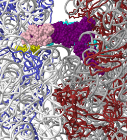The full ribosome structure used in this version of the interactive tool is from Thermus thermophilus. However, the conservation of the ribosome make it applicable to sites in the E. coli rRNA as well, and more easily allow comparison to other maps based on the same model. The presence of mRNA,as well as tRNAs in the A,P, and E sites, makes the major functional regions conspicuous.