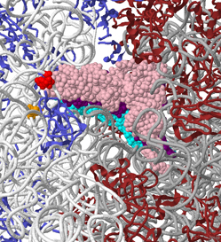 The full ribosome structure used in this interactive tool is from E. coli, making it applicable to visualize the site of nucleotide modification. The presence of A-, P-, and E-site tRNAs helps make the major functional regions conspicuous.